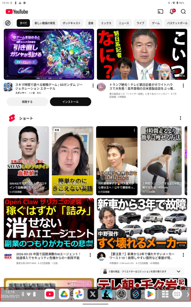 例えばYouTubeの起動時に「<」を押すと、Dock(タスクバー)が表示されます